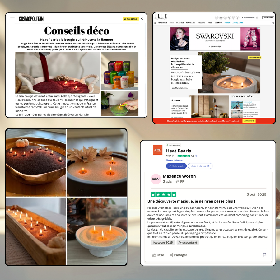 Parce quâune bougie classique = cire qui coule, odeur douteuse, nettoyage, gaspillage. HeatPearls = des perles de cire vĂ©gĂ©tale propre,une ambiance modulable,zĂ©ro rĂ©sidu,des couleurs interchangeables,et une vraie Ă©lĂ©gance visuelle. Une seule bougie â dix ambiances, zĂ©ro contrainte.